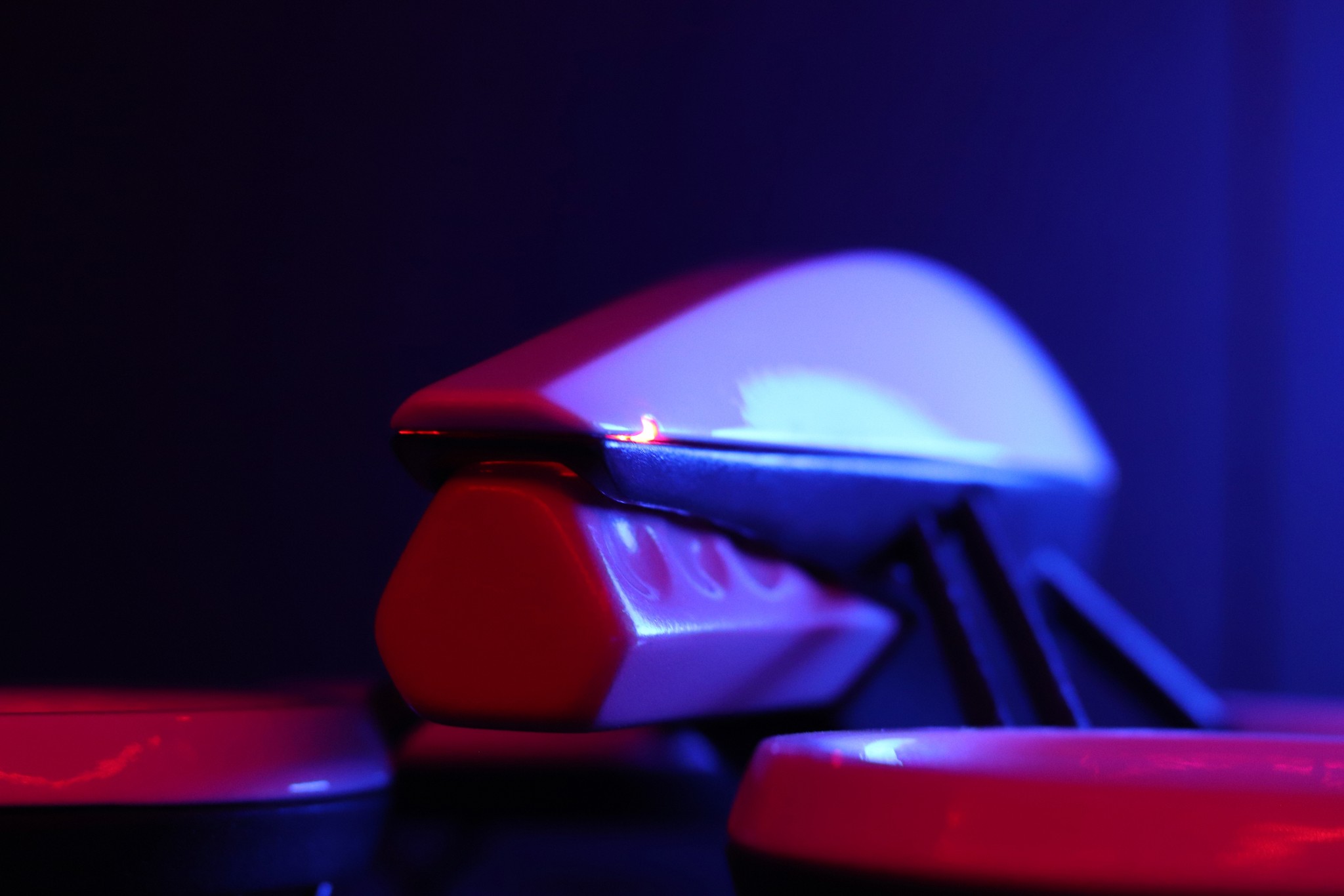 The top shell is glossy white for visibility, and the textured black bottom is for durability.